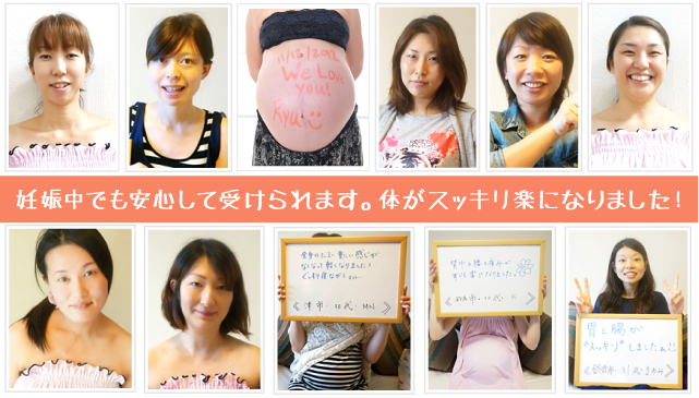 「安定期に入ったばかりの妊婦さん」から「出産間近の妊婦さん」まで、幅広い妊娠期の症状を施術して、結果を出し喜ばれています。