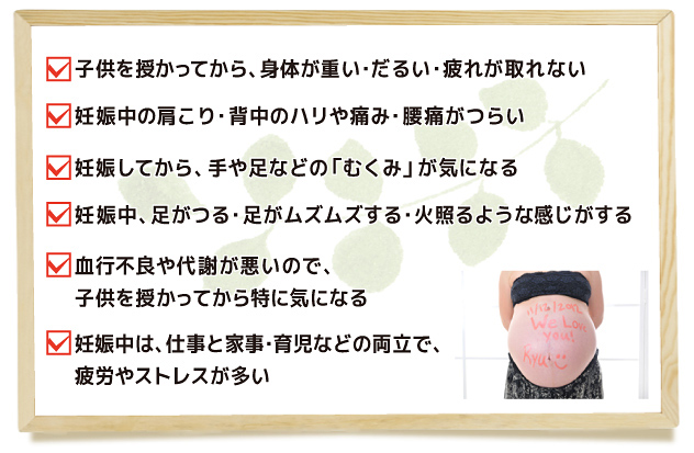 子供を授かると、赤ちゃんが育つために女性の身体は大きく変化します。ホルモンのバランスも妊娠前とは大きく変わり、お体の疲労感・肩こり・頭痛・むくみ・腰痛・不眠・情緒不安定・こむら返り・ほてり・肌荒れなどの症状がおこるのです。