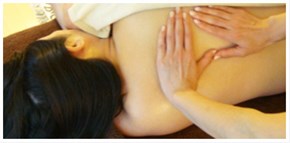 施術中の姿勢は、妊婦さんとお腹の赤ちゃんに負担のないシムス位(横向き)で施術します。お腹の大きな妊婦さんでも、楽な姿勢で心地良くマッサージを受けて頂けます。