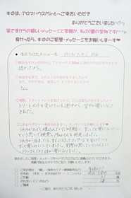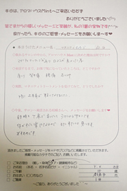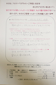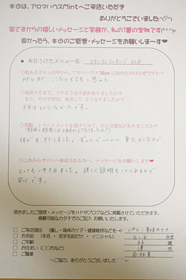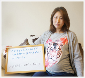 妊娠して、肩と腰、足のむくみ、精神面にきていましたが、マタニティマッサージを受けて、心身ともにスッキリ・本当にリラックスできました。