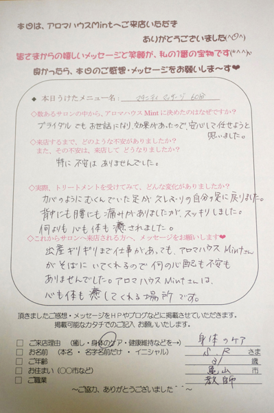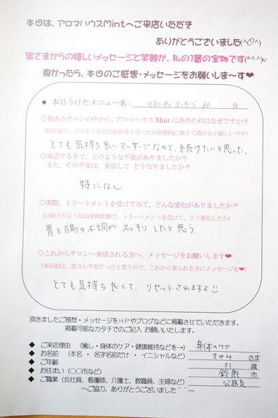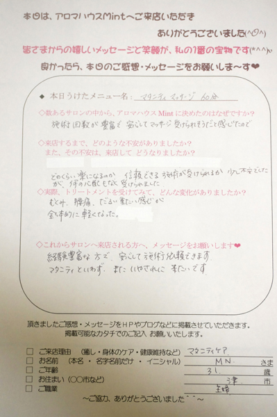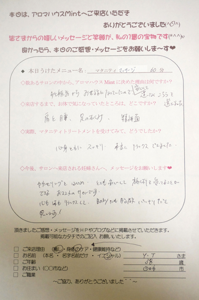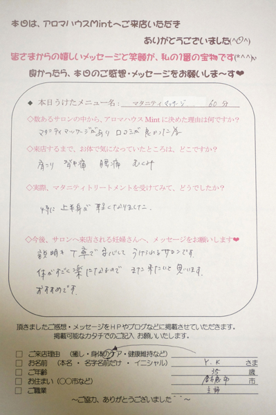 妊娠前からサロンでお世話になっていたので、安心して迷いなく、アロマハウスMintさんを選びました。