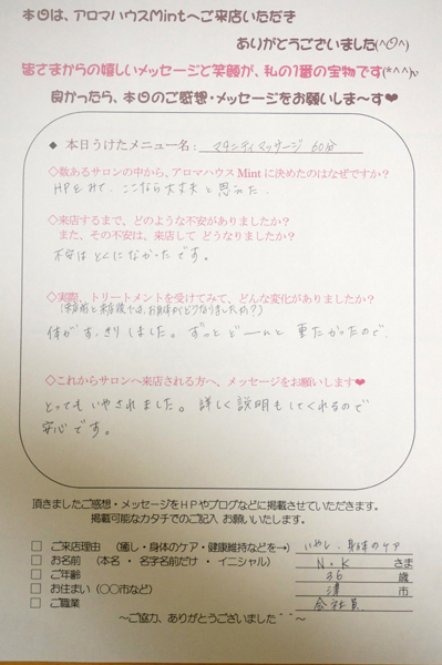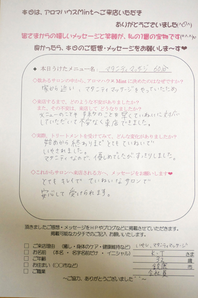 Mintさんは、カウンセリングをはじめ、丁寧で細やかな対応をして下さるので、とても安心して施術を受けることができます。心も体もリラックスして、Babyにも胎教にもバッチリだと思います!妊婦さんにとっても、本当にオススメのサロンです。