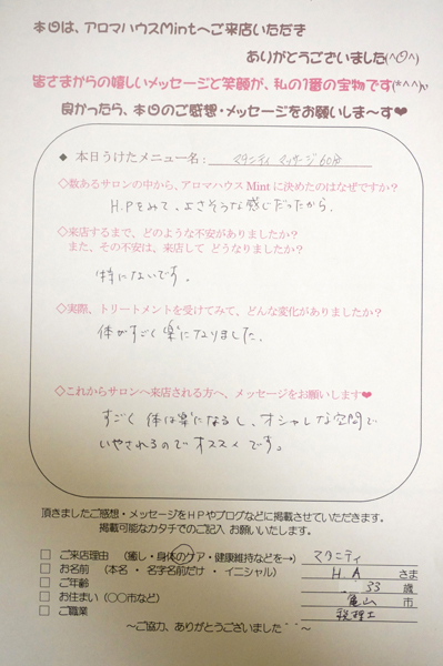 数あるサロンの中から、アロマハウスMintに決めたのはなぜですか?